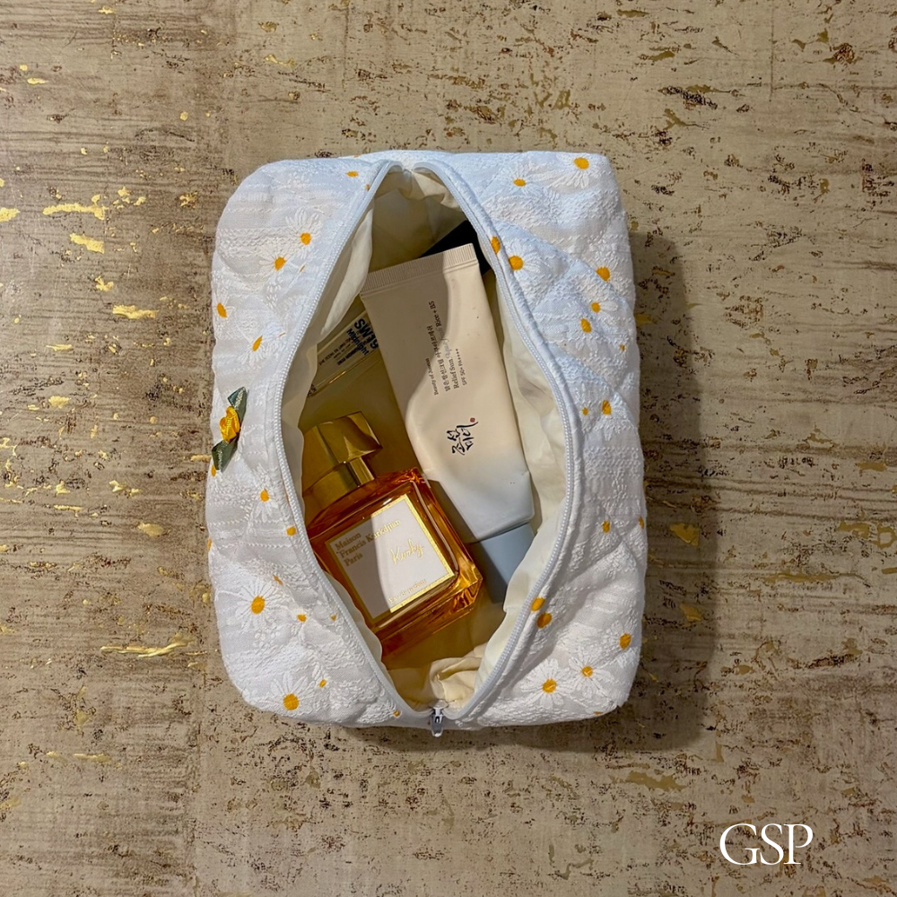 Het handgemaakte skincare tasje is perfect om je favoriete producten in te bewaren. Handig om mee te nemen in je tas, op reis of om al je skincare en make-up georganiseerd te houden. De Sunny Lace heeft een witte kanten buitenkant met bloemmotiefjes, waarbij de kern van elke bloem is afgewerkt met een subtiel oranje stipje. De binnenkant is uitgevoerd in een warme beige tint, wat zorgt voor een rustige, natuurlijke uitstraling. Dit tasje is verkrijgbaar met of zonder het oranje bloemetje op de buitenkant. Dankzij het compacte formaat neem je dit make-up tasje moeiteloos mee in je handtas of koffer.